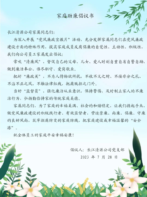九游老哥J9俱乐部官网清源公司党支部开展家庭助廉活动,向员工家属发送《家庭助廉倡议书》,呼吁广大员工家属发挥在党风廉政建设方面的特殊作用,常吹“清廉风”、把好“廉政关”、当好“监督员”,筑牢拒腐防变的家庭防线;送上一封廉洁家书,搭建起公司与家属沟通的桥梁,其中有女儿对父亲的孺慕之情,有父亲对孩子的殷殷期望,有长姐对妹妹的谆谆嘱托,纸短情长、廉润万家,家庭助廉活动凝聚起廉洁齐家的强大合力,推动崇德尚廉蔚然成风。
