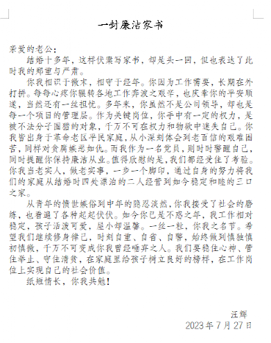 正是因为公司持续不断开展党风廉政宣传教育工作,培育了良好的廉洁文化,绝大多数员工都拥有很高的警觉性。同时,良好的家风也是廉洁从业的重要支撑,不在社交媒体随意表达物质欲望。遇到天降礼物,不贪图便宜,及时主动向纪检报告,合理保护自己。切实践行廉洁从业,从小做起,从我做起。