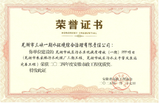 本网讯(雷进发 程威强) 近日,2024年度安徽省市政工程优质奖获奖项目名单公布,芜湖水管家公司投资建设的芜湖市城区污水系统提质增效(一期)项目喜获2024年度“安徽市政工程优质奖”。